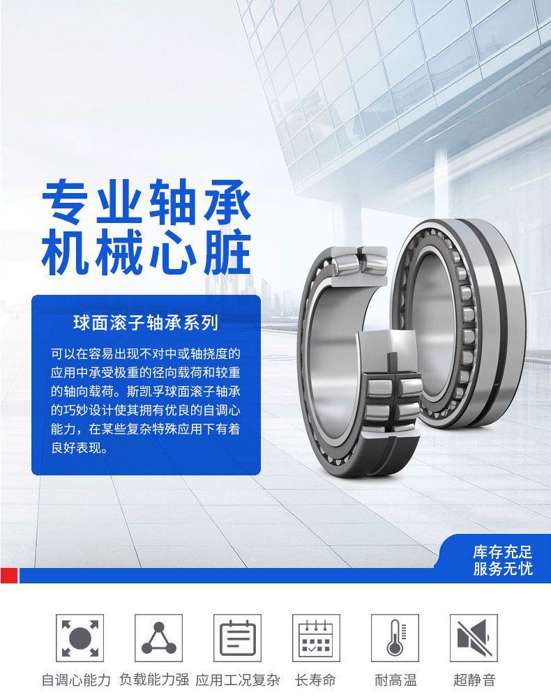 SKF球面滾子軸承的滾子的制造極為嚴格的公差尺寸和形式。每個輥子在集合中的其它輥的尺寸和形狀幾乎是相同的。優(yōu)化負荷分布輥軸承的使用壽命最大化。